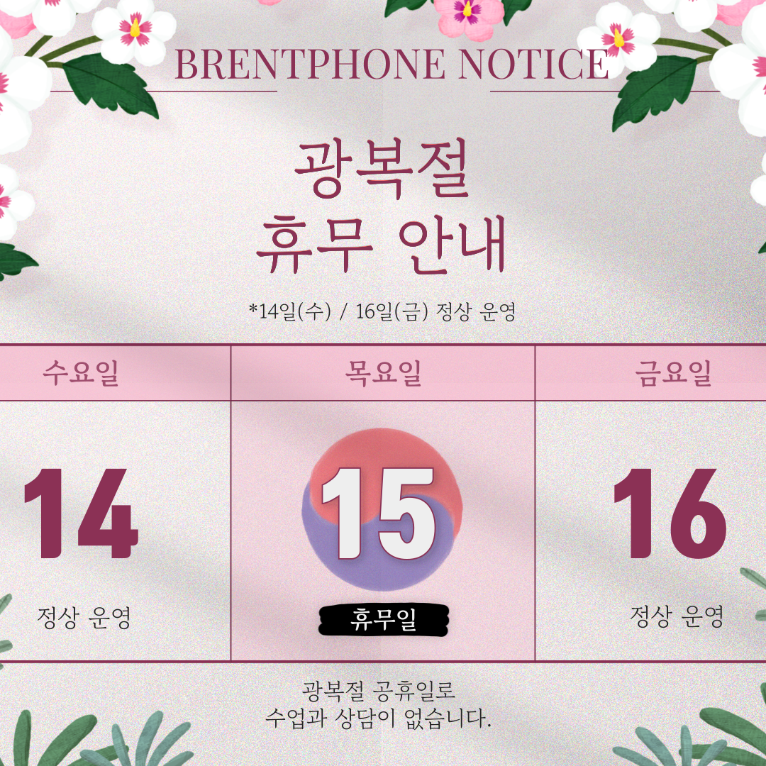 2024년 8월 15일 광복절은 공휴일로 모든 수업과 상담을 쉬어갑니다.